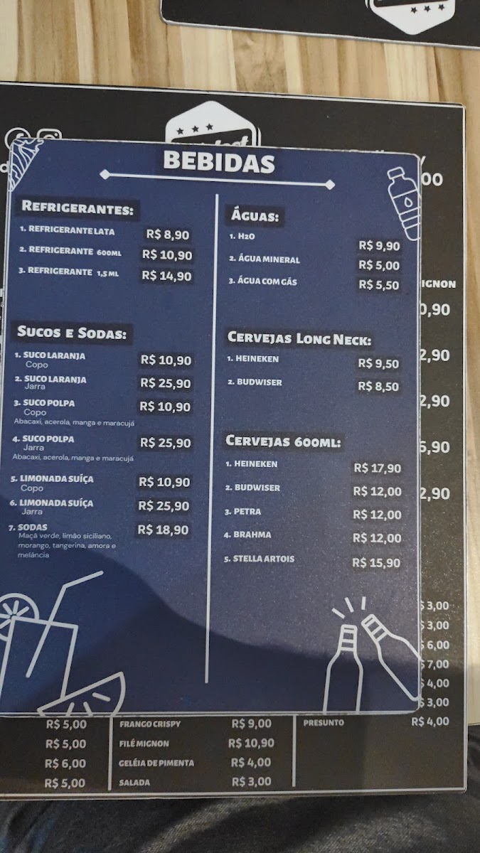 Finally, Hamburgueria e Bar is a great choice for those looking to enjoy both a delicious burger and refreshing drinks in a lively atmosphere. With its mix of food and beverages, this part of the menu brings a fun dining experience suitable for gatherings or casual hangouts.
